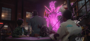 Stargirl, Wildcat, Shiv, and Pat head down the street. Pat says that his robot is under repair. A gap to the Shadowlands opens above American Dream.