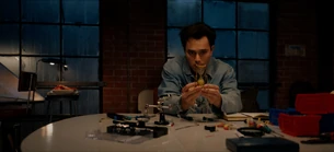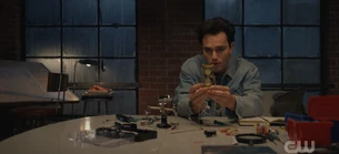 At the garage, Rick goes back to work on the hourglass, but it doesn't work. Rick grabs the duffle bag with his costume and goes to fight. Mike and Jakeem play cards while they wait, and Zeek tells them that no junkyards are open and he can't find the part to fix STRIPE that night. Mike figures Pat knew, and Jakeem tells Mike that Pat was trying to protect his son.