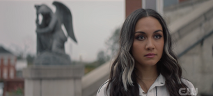 - When Cindy shows up outside the church to find Yolanda, the white streaks in her hair aren't as prominent, and notably shorter.