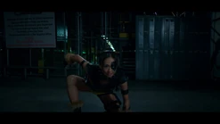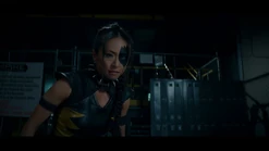 Around her waist is a rigid bronzed belt that holds ammunition for an easier reloads of her guns. The buckle resembles that of a skull and is fairly large. Her shorts are yellow with black rectangular edgings similar to that of her top but in the reverse color scheme. They reach a quarter of the way down her thighs. On her left leg at the cuff of her shorts, is the first of three straps for another gun holster that holds her third visible gun. The straps all have black buckles.